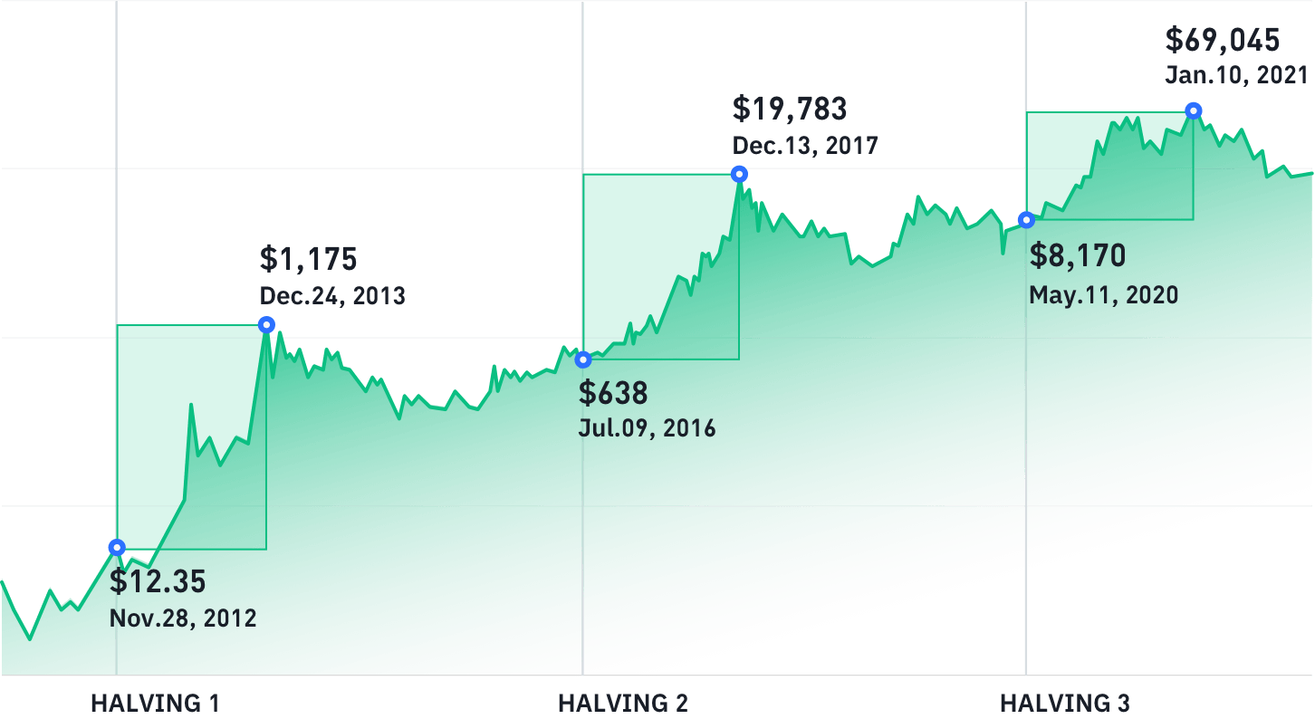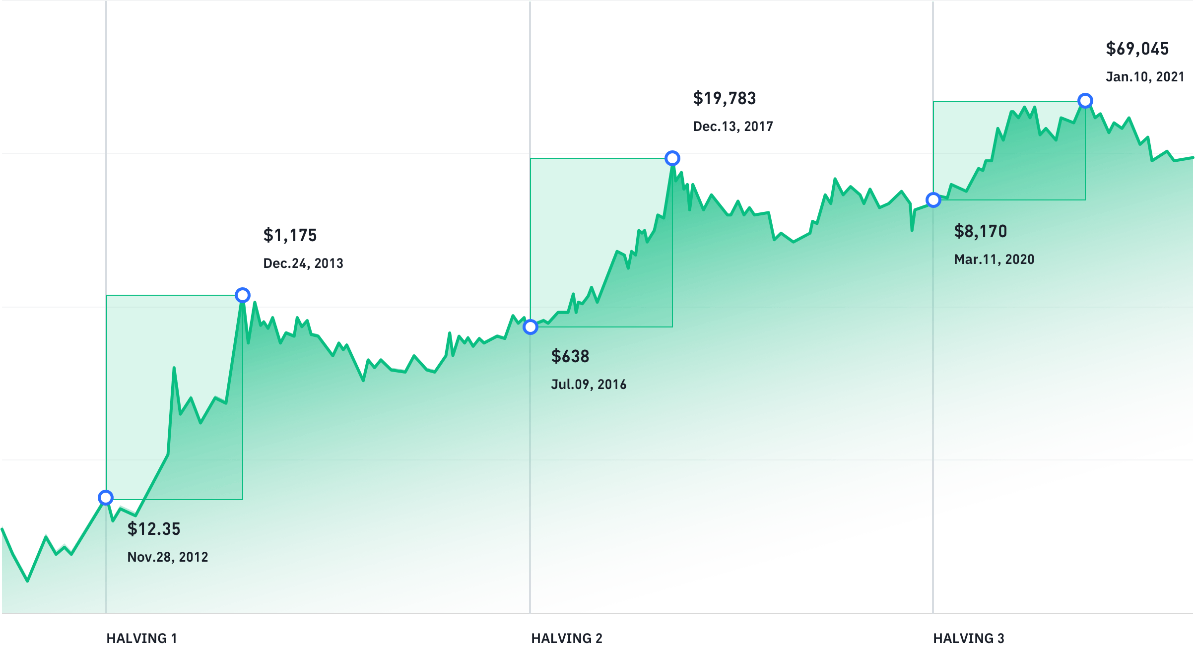 Berdasarkan halving sebelumnya, harga Bitcoin biasanya naik lagi dalam beberapa bulan atau tahun berikutnya, mulai dari harga sebelum halving dan kemudian terus meningkat.